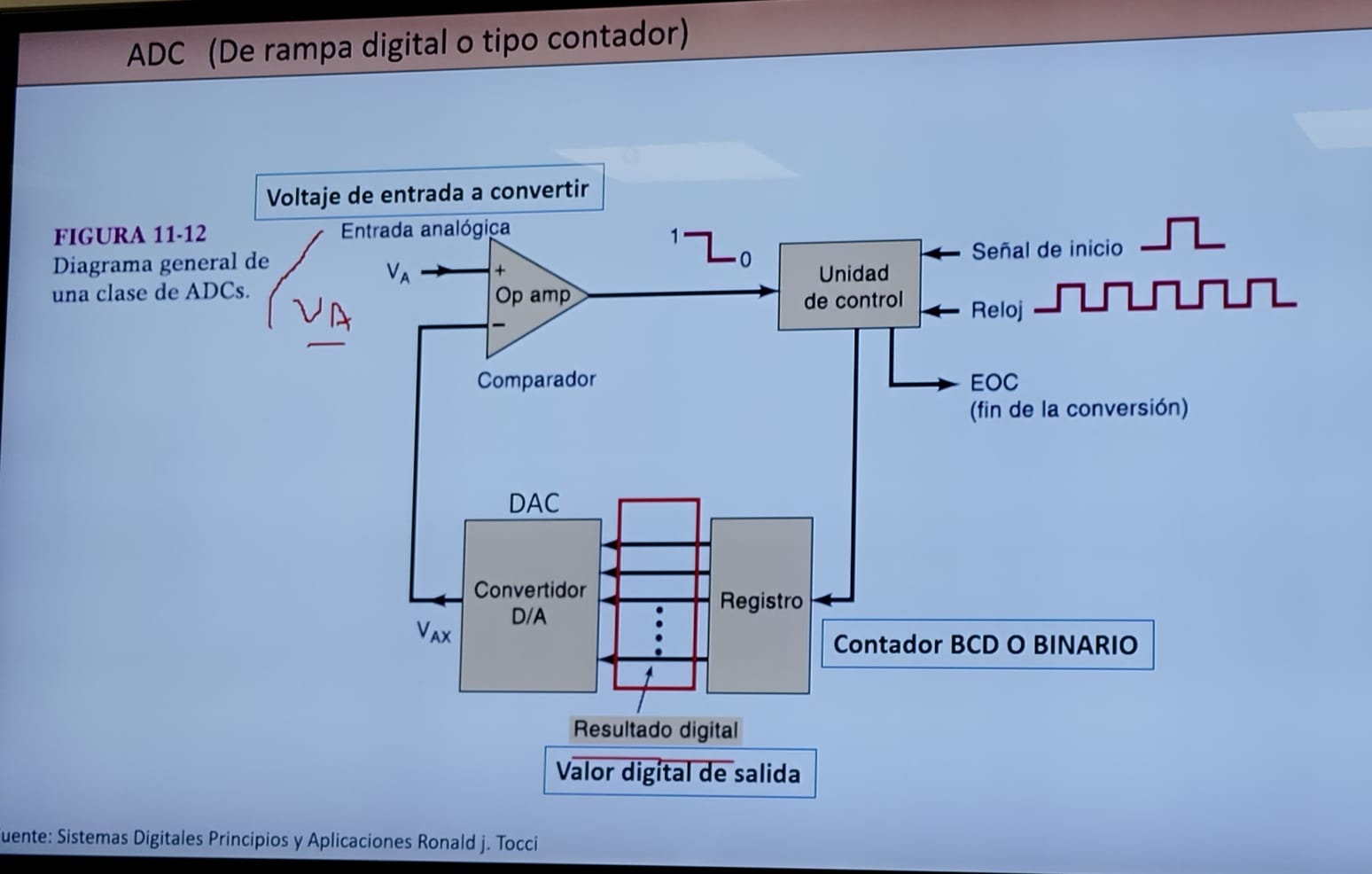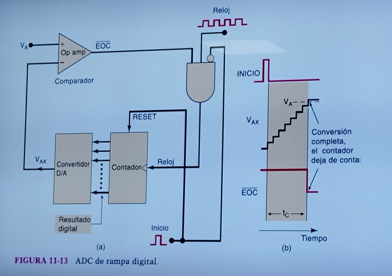 Un valor más grande requerirá más escalones antes de que el voltaje de la escalera exceda a Va. El tiempo máximo de conversión ocurrir+a cuando Va se encuentre justo debajo de la escala completa, de manera que Vax deberá avanzar hasta el último intervalo para activar a EOC. Para un convertidor de N bits, esto será: