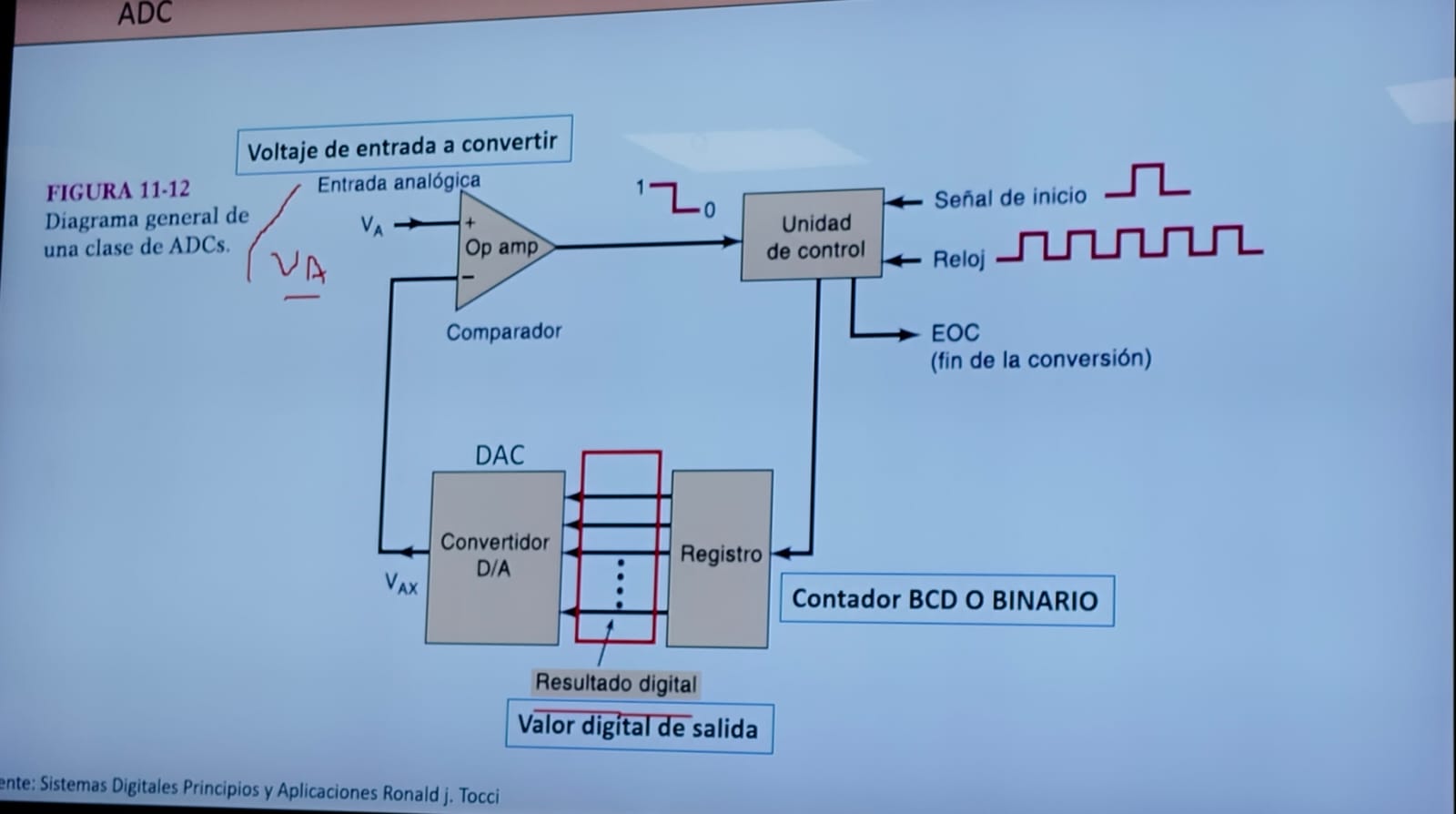 Un convertidor ADC toma un voltaje de entrada analógico y después de cierto tiempo produce un código digital de N bits que representa a la entrada analógica. Varios tipos de ADC’s utilizan un DAC como parte de los circuitos internos de conversión.